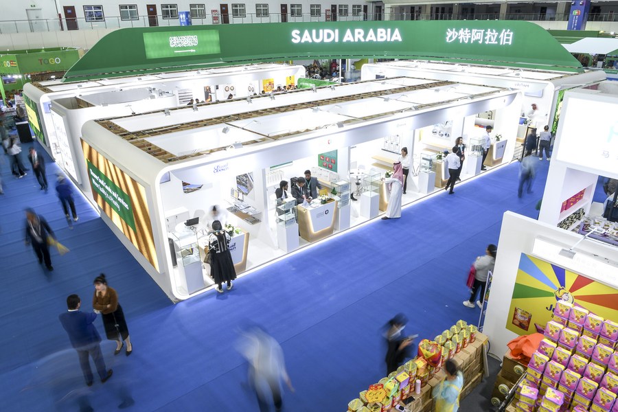 This photo taken on Sept. 21, 2023 shows the booth of Saudi Arabia at the sixth China-Arab States Expo in Yinchuan, northwest China's Ningxia Hui Autonomous Region. (Xinhua/Feng Kaihua)