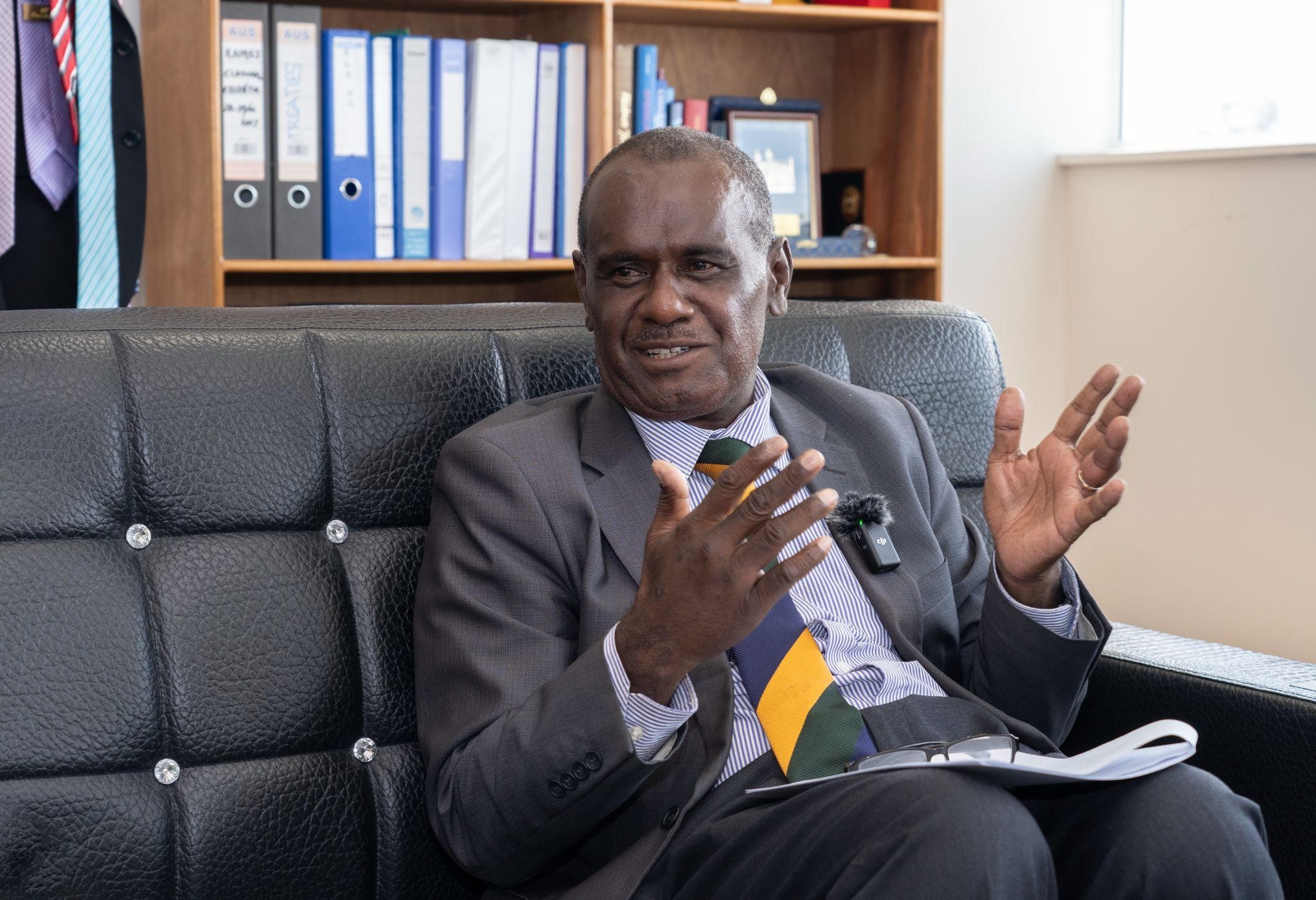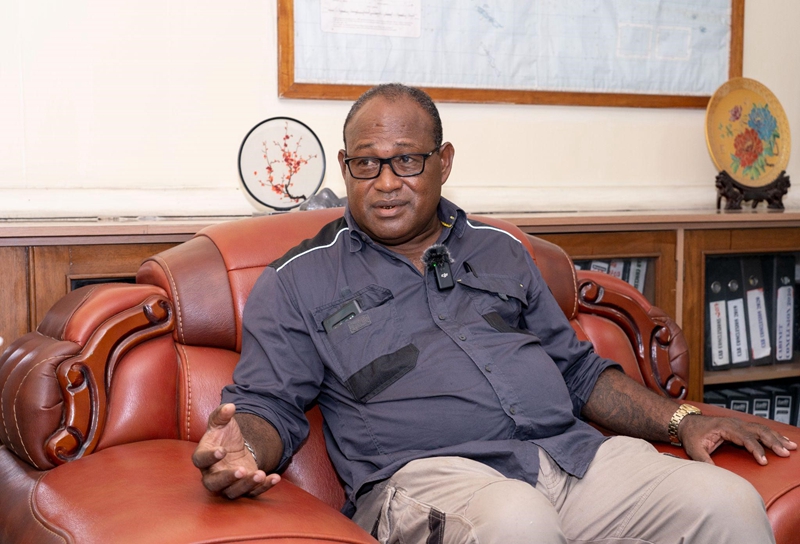 Solomon Islands Deputy Prime Minister and Minister for Infrastructure Development Manasseh Maelanga speaks with a People’s Daily Online reporter in an exclusive interview in Honiara, capital of the Solomon Islands, on Sept. 13, 2023. (Photo/Ji He)