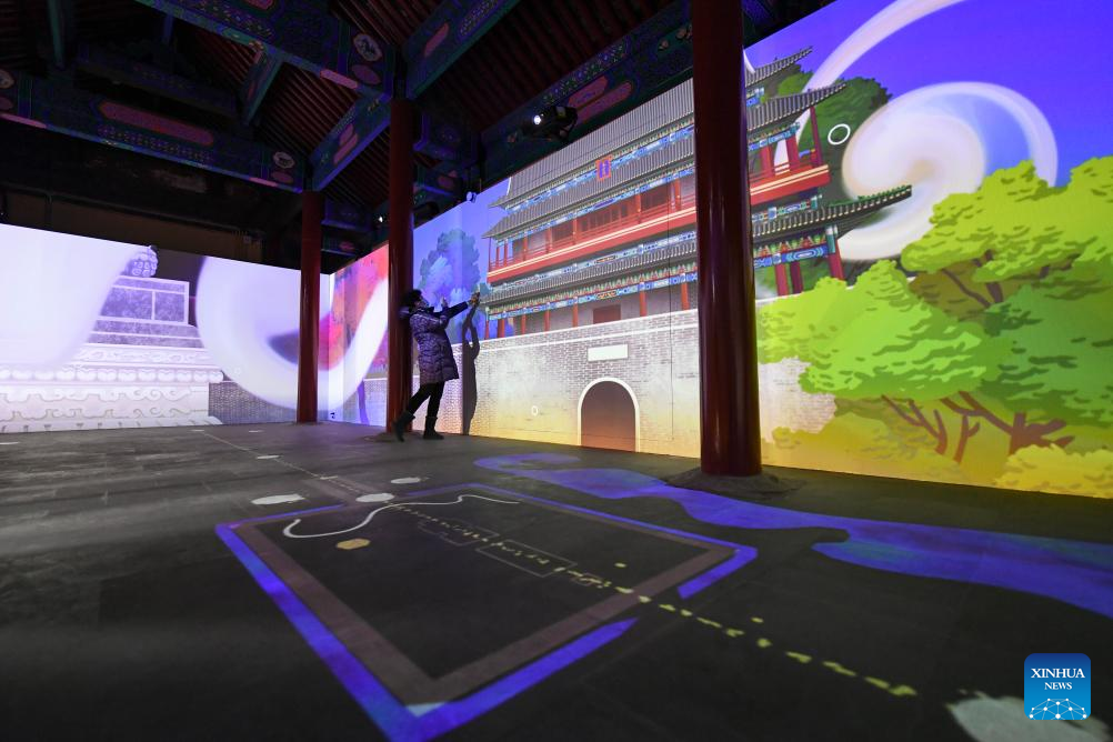 This photo taken on Jan. 18, 2024 shows a digital art hall at the Hong'en Temple in Beijing, capital of China. The over 700-year-old Hong'en Temple opened to public recently. It is located to the north of the Bell Tower in Beijing, with Beijing Central Axis passing through its west annex hall.