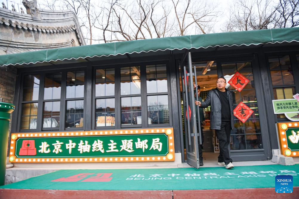 This photo taken on Jan. 18, 2024 shows a Beijing Central Axis-themed post office at Hong'en Temple in Beijing, capital of China. The over 700-year-old Hong'en Temple opened to public recently. It is located to the north of the Bell Tower in Beijing, with Beijing Central Axis passing through its west annex hall.
