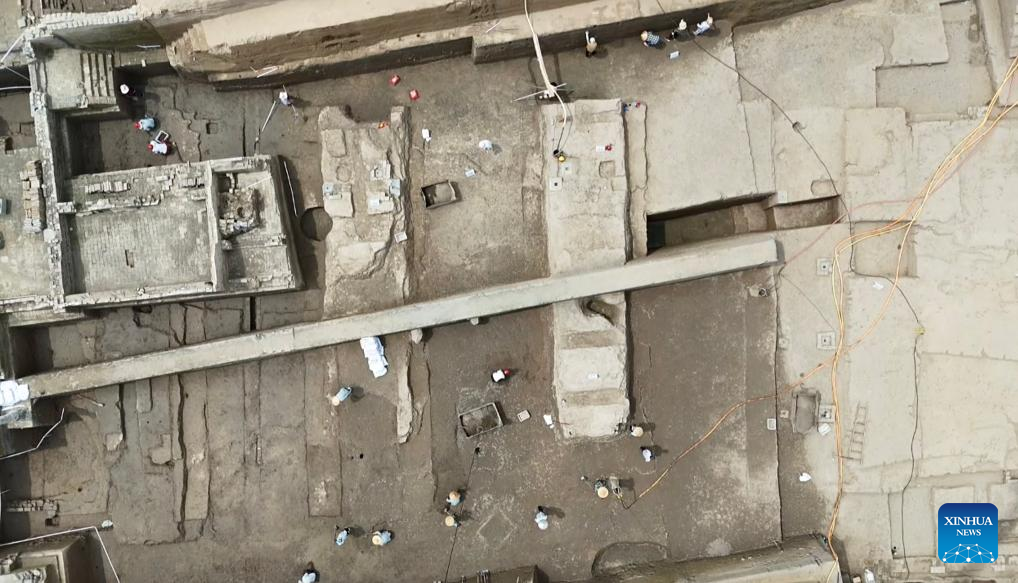 An aerial drone photo taken on June 18, 2024 shows the excavation site of the ruins of Jinglong Gate from the Northern Song Dynasty in Kaifeng, central China's Henan Province. (Xinhua/Yuan Yueming)