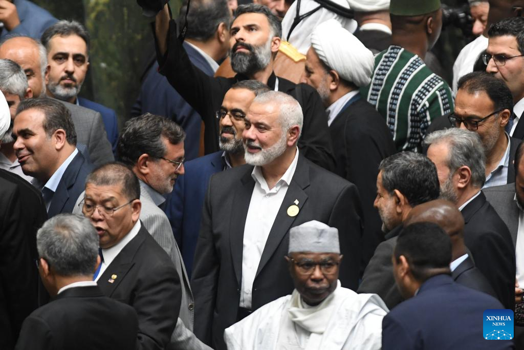 This photo shows Hamas Politburo Chief Ismail Haniyeh (C) in Tehran, Iran, July 30, 2024. Haniyeh and one of his bodyguards have been killed in Iranian capital city of Tehran, Iran's Islamic Revolution Guards Corps (IRGC) said on Wednesday. (Xinhua/Shadati)