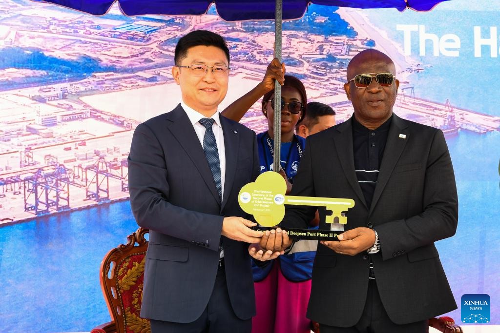 A representative of China Harbor Engineering Company (CHEC) hands over the "key" to the second phase of the Kribi Deep Seaport to a representative of the Port Authority of Kribi (PAK) in Kribi, southern Cameroon, on Feb. 21, 2025. China Harbor Engineering Company (CHEC) on Friday handed over the second phase of the Kribi Deep Seaport to authorities in southern Cameroon. (Xinhua/Kepseu)