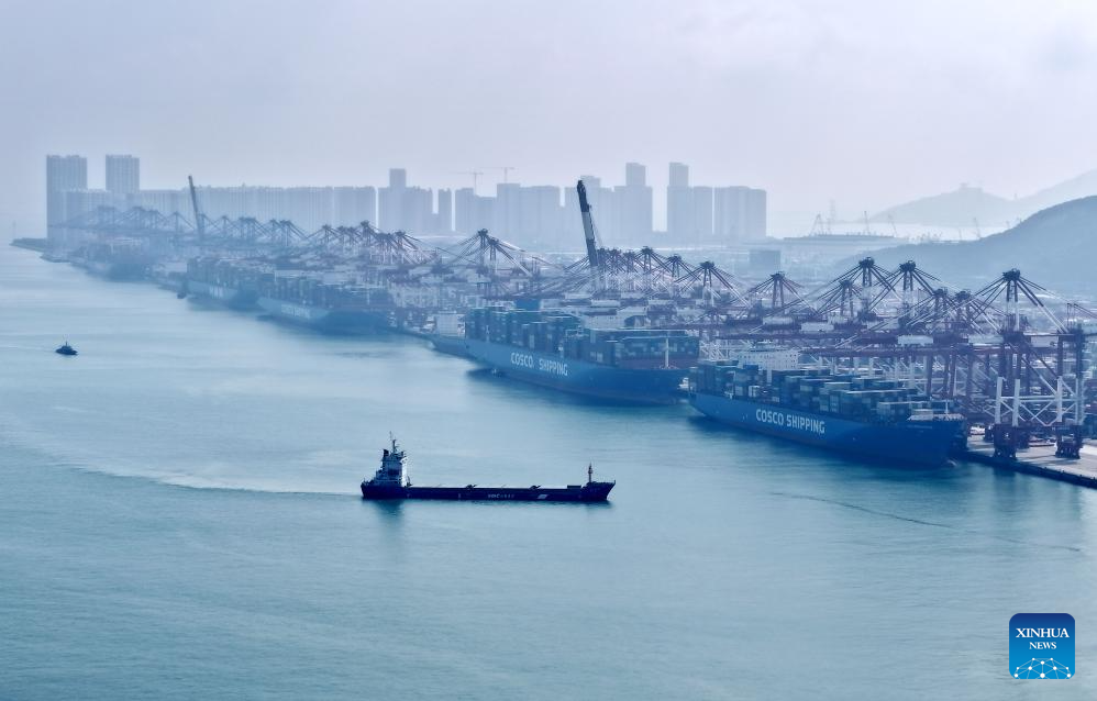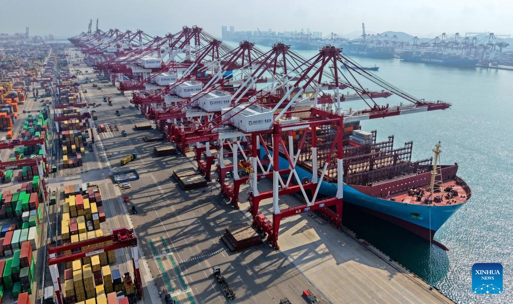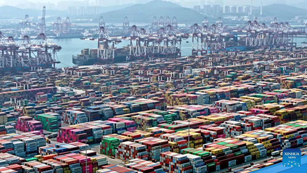 An aerial drone photo taken on Aug. 19, 2025 shows a view of Qingdao Port in Qingdao, east China's Shandong Province. As of the end of July, Qingdao Port has added 22 new outbound trade routes this year, bringing its total to 233 and connecting to over 700 ports in more than 180 countries and regions. (Xinhua/Li Ziheng)