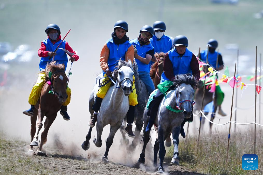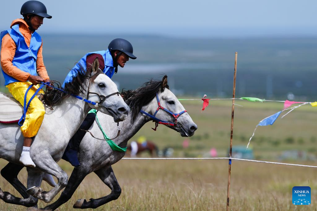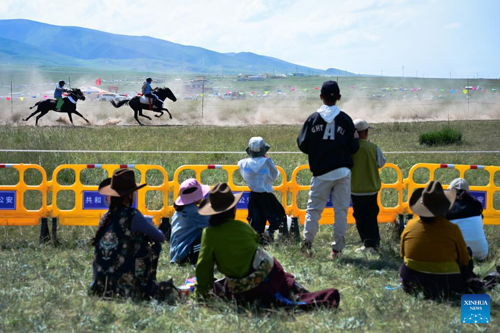 Riders are pictured in a horse race in Gonghe County of Hainan Tibetan Autonomous Prefecture, northwest China's Qinghai Province, on Aug. 17, 2025. A singing competition of Tibetan love songs "Layi" is held in conjunction with a horse race here from Aug. 15 to 21. Evening parties featuring Tibetan square dance Guozhuang are also hosted in duration of the two events. (Xinhua/Qi Zhiyue)