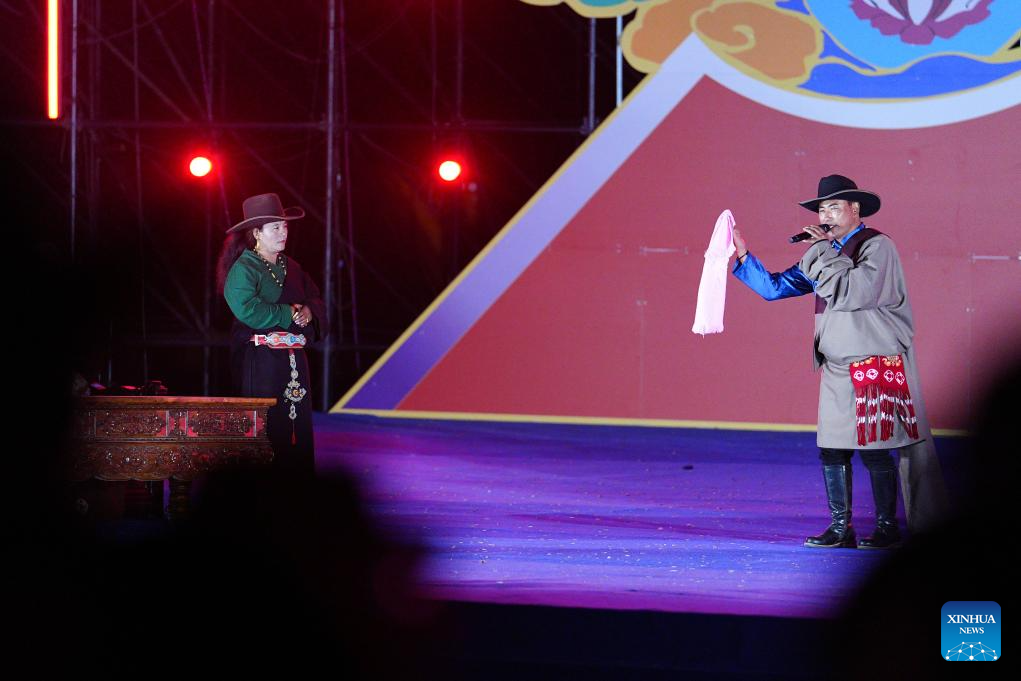 Participants are pictured during a singing competition of Tibetan love songs "Layi" in Gonghe County of Hainan Tibetan Autonomous Prefecture, northwest China's Qinghai Province, on Aug. 17, 2025. A singing competition of Tibetan love songs "Layi" is held in conjunction with a horse race here from Aug. 15 to 21. Evening parties featuring Tibetan square dance Guozhuang are also hosted in duration of the two events. (Xinhua/Qi Zhiyue)