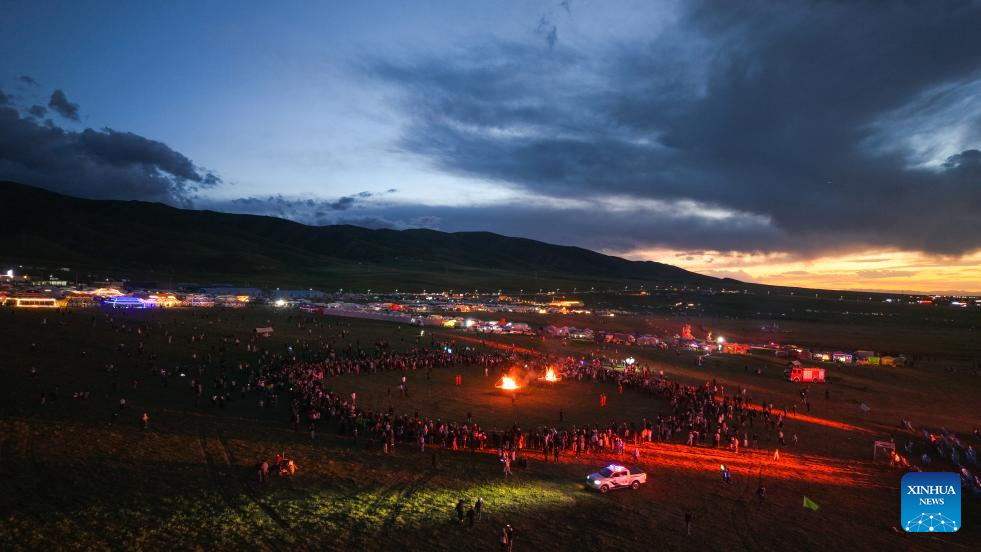 An aerial drone photo taken on Aug. 15, 2025 shows a scene during a Guozhuang dance party in Gonghe County of Hainan Tibetan Autonomous Prefecture, northwest China's Qinghai Province. A singing competition of Tibetan love songs "Layi" is held in conjunction with a horse race here from Aug. 15 to 21. Evening parties featuring Tibetan square dance Guozhuang are also hosted in duration of the two events. (Xinhua/Qi Zhiyue)