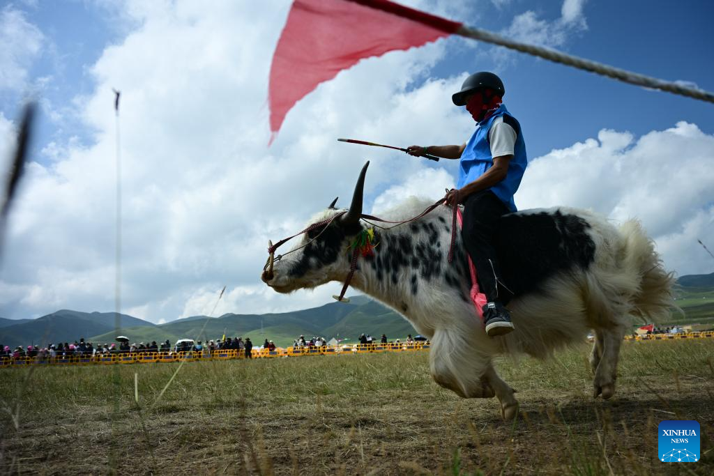 A rider is pictured in a yak race in Gonghe County of Hainan Tibetan Autonomous Prefecture, northwest China's Qinghai Province, on Aug. 19, 2025. A singing competition of Tibetan love songs "Layi" is held in conjunction with a horse race here from Aug. 15 to 21. Evening parties featuring Tibetan square dance Guozhuang are also hosted in duration of the two events. (Xinhua/Qi Zhiyue)