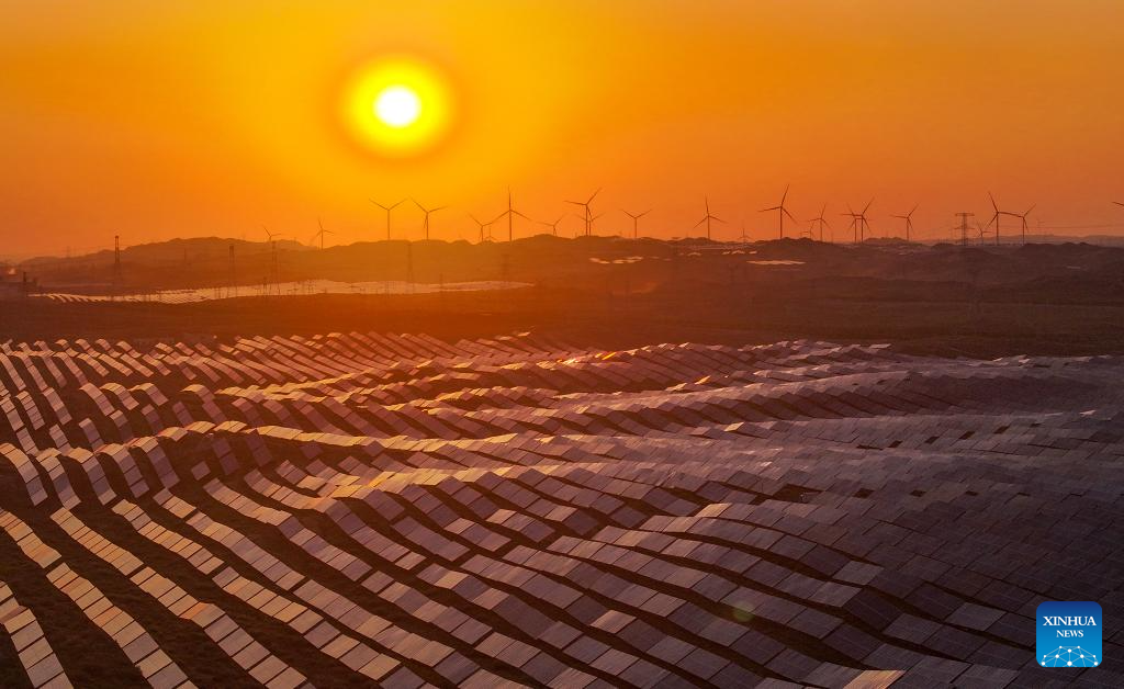 An aerial drone photo taken on Aug. 19, 2025 shows the supporting new energy project of the Ningxia-Hunan ±800 kV ultra-high voltage (UHV) direct current transmission project, in northwest China's Ningxia Hui Autonomous Region. The Ningxia-Hunan ±800 kV UHV direct current transmission project, which brings electricity from northwest China's Ningxia Hui Autonomous Region to central China's Hunan Province, was put into operation for power transmission on Wednesday.