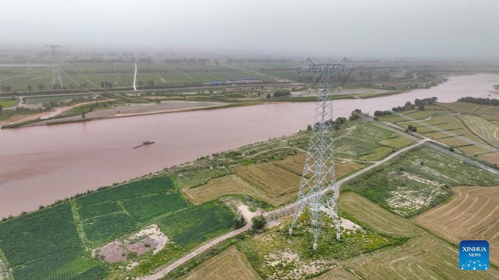 An aerial drone photo taken on Aug. 20, 2025 shows the direct current transmission lines, across the Yellow River, of the Ningxia-Hunan ±800 kV ultra-high voltage (UHV) direct current transmission project in Zhongwei City, northwest China's Ningxia Hui Autonomous Region. The Ningxia-Hunan ±800 kV UHV direct current transmission project, which brings electricity from northwest China's Ningxia Hui Autonomous Region to central China's Hunan Province, was put into operation for power transmission on Wednesday.