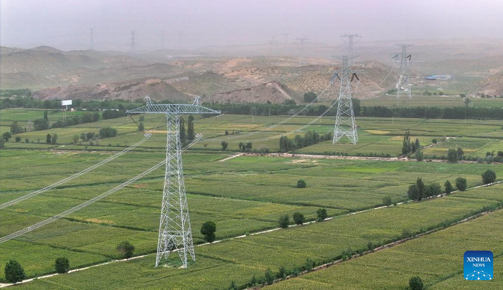 An aerial drone photo taken on Aug. 20, 2025 shows the direct current transmission lines of the Ningxia-Hunan ±800 kV ultra-high voltage (UHV) direct current transmission project in northwest China's Ningxia Hui Autonomous Region. The Ningxia-Hunan ±800 kV UHV direct current transmission project, which brings electricity from northwest China's Ningxia Hui Autonomous Region to central China's Hunan Province, was put into operation for power transmission on Wednesday.