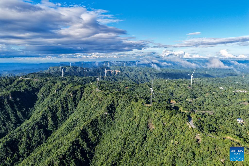 An aerial drone photo shows the scenery of Huangshui Town in Shizhu County, southwest China's Chongqing Municipality, Aug. 20, 2025. Huangshui has turned itself into a well noted tourist destination by taking full advantage of local forest and landscape resources. So far this year, the town has received 16 million visitors, who brought in a combined revenue of 11.2 billion yuan (1.56 billion U.S. dollars). (Xinhua/Tang Yi)