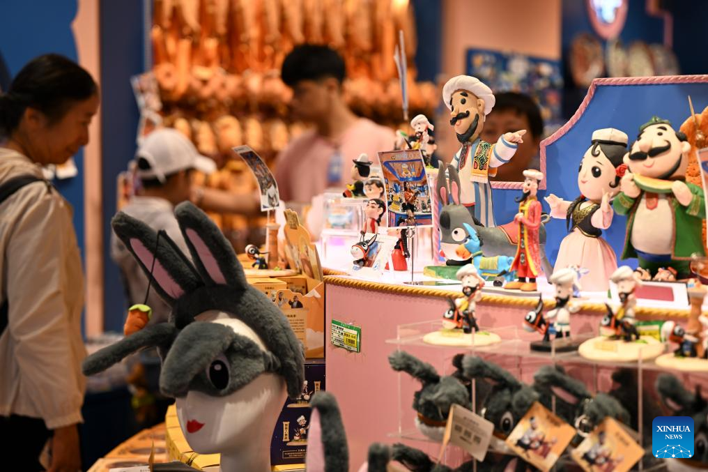 Tourists select cultural and creative products at the Grand Bazaar in Urumqi, northwest China's Xinjiang Uygur Autonomous Region, Aug. 21, 2025. Scenic areas across China have entered peak season for tourism. The Grand Bazaar receives an average of more than 200,000 daily tourists since July this year. (Xinhua/Wang Fei)