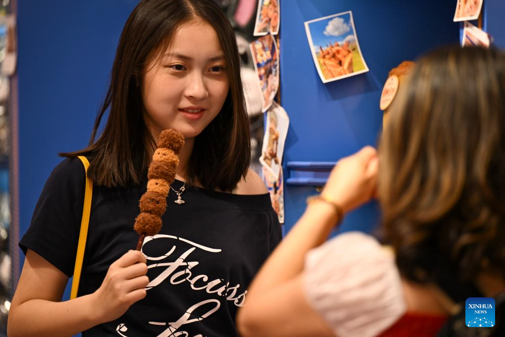 A tourist selects cultural and creative products at the Grand Bazaar in Urumqi, northwest China's Xinjiang Uygur Autonomous Region, Aug. 21, 2025. Scenic areas across China have entered peak season for tourism. The Grand Bazaar receives an average of more than 200,000 daily tourists since July this year. (Xinhua/Wang Fei)