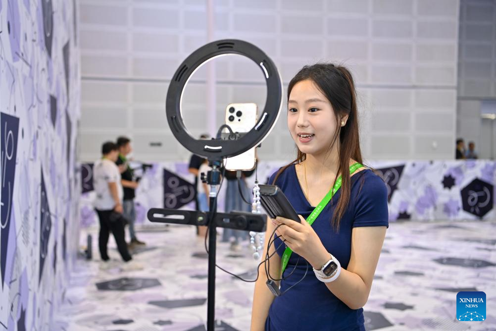 A staff member hosts a live streaming show at the 7th Shanxi Cultural Industries Fair in Taiyuan, north China's Shanxi Province, Aug. 21, 2025. The fair kicked off here on Thursday and will last till Aug. 25, attracting about 2,000 exhibitors from over 30 countries and regions worldwide. (Xinhua/Yang Chenguang)