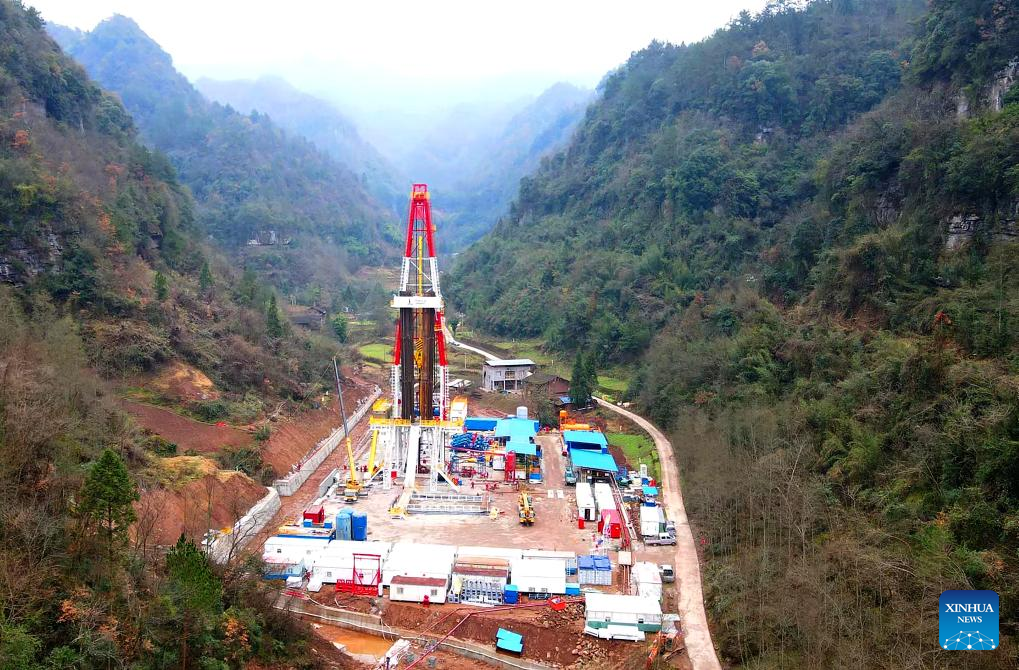 An aerial drone photo taken on Feb. 26, 2025 shows a scene at the Hongxing shale gas field in Lichuan City, Enshi Tujia and Miao Autonomous Prefecture, central China's Hubei Province. (Photo by Song Guoliang/Xinhua)