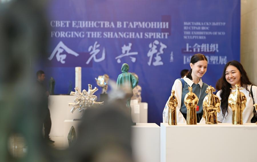 Attendees of the Inter-Civilizational Dialogue among Shanghai Cooperation Organization (SCO) Countries 2025 visit a sculpture exhibition in north China's Tianjin, July 23, 2025. (Xinhua/Li Ran)