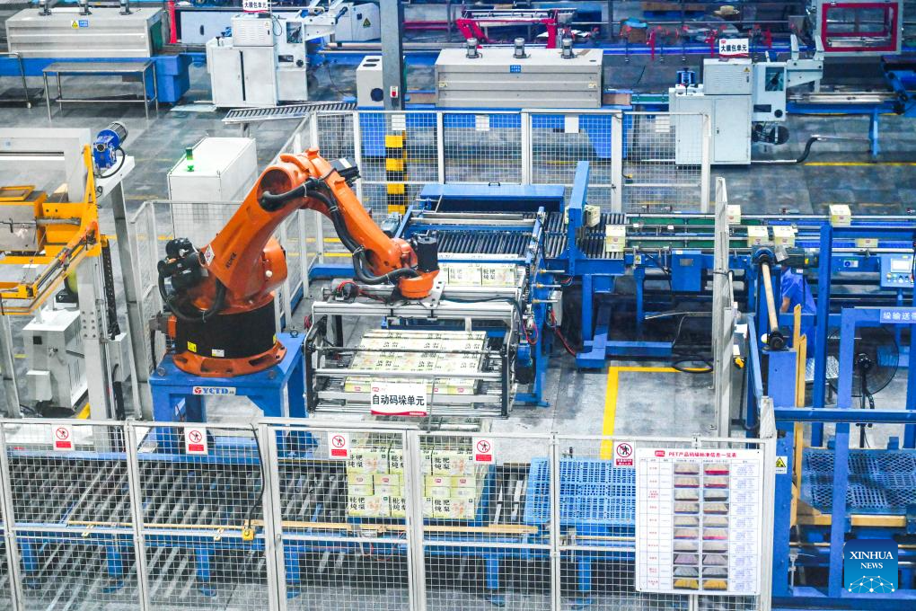 A robotic arm is seen at the smart workshop of Panpan Foods in Jinjiang, southeast China's Fujian Province, Aug. 19, 2025. (Xinhua/Lin Shanchuan)