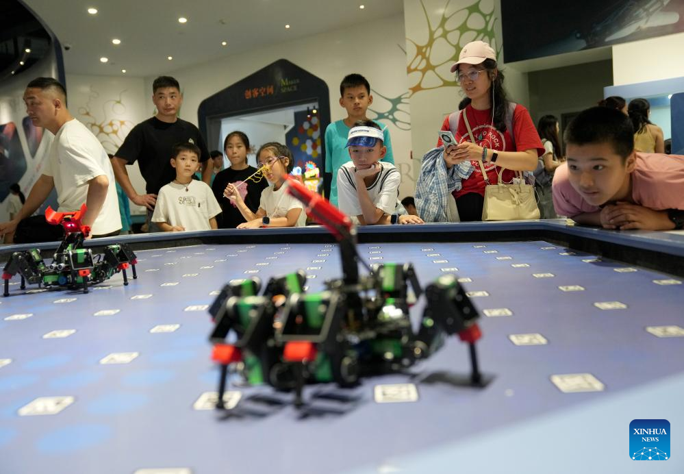Children watch hexapod robots dancing at Zhejiang Science and Technology Museum in Hangzhou, east China's Zhejiang Province, Aug. 22, 2025. Children participate in various activities during summer vacation across the country. (Xinhua/Han Chuanhao)