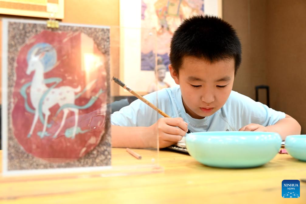 A kid reproduces Dunhuang murals at a classroom in Dunhuang, northwest China's Gansu Province, Aug. 22, 2025. Children participate in various activities during summer vacation across the country. (Photo by Zhang Xiaoliang/Xinhua)
