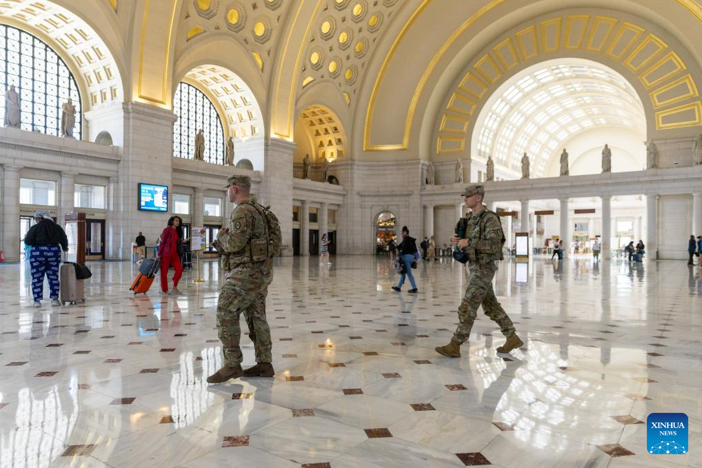Members of the National Guard stand guard at Union Station in Washington, D.C., the United States, on Aug. 22, 2025. (Xinhua/Hu Yousong)