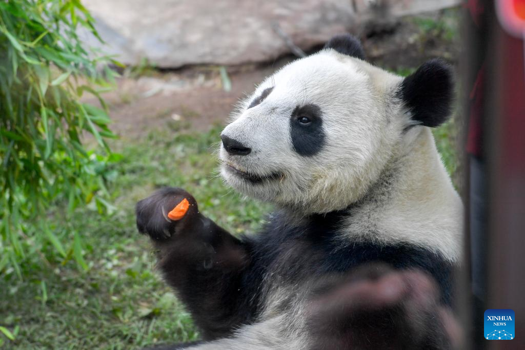 Giant panda Katyusha eats at Moscow Zoo in Moscow, Russia, Aug. 24, 2025. Katyusha, Russia's first giant panda cub born at Moscow Zoo, celebrated her second birthday on Sunday. (Photo by Alexander Zemlianichenko Jr/Xinhua)
