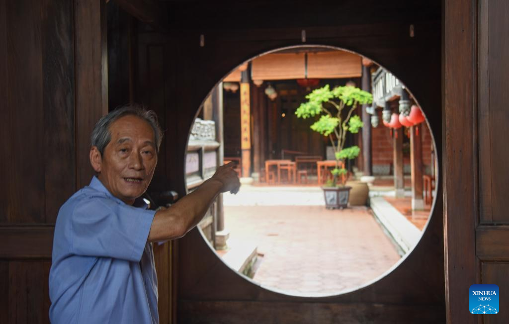 Lin Kuang-hui, a ninth-generation descendant of the Lin family and a founding member of the association for relatives of patriots in Taiwan who fought against Japanese occupation, speaks during an interview with Xinhua, at the Lin family's old mansion in Wufeng, Taichung City, southeast China's Taiwan, June 3, 2025.(Xinhua/Li Jianhua)