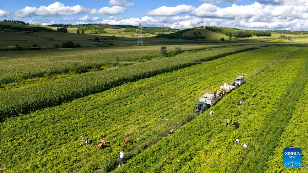 An aerial drone photo taken on Aug. 24, 2025 shows villagers picking golden berries at a field in Morin Dawa Daur Autonomous Banner of Hulun Buir, north China's Inner Mongolia Autonomous Region. Early autumn sees golden berries, also known as ground berries, entering the harvest season in Morin Dawa Daur Autonomous Banner, Hulun Buir City.