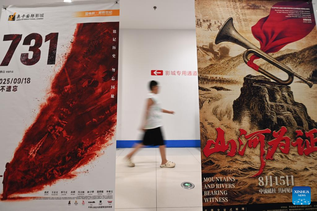 A spectator walks past movie posters at a cinema in Qingzhou, east China's Shandong Province, Aug. 17, 2025. China's summer box office revenue has surpassed 11 billion yuan (about 1.5 billion U.S. dollars) as of Sunday, with homegrown titles dominating the season's top earners. (Photo by Wang Jilin/Xinhua)