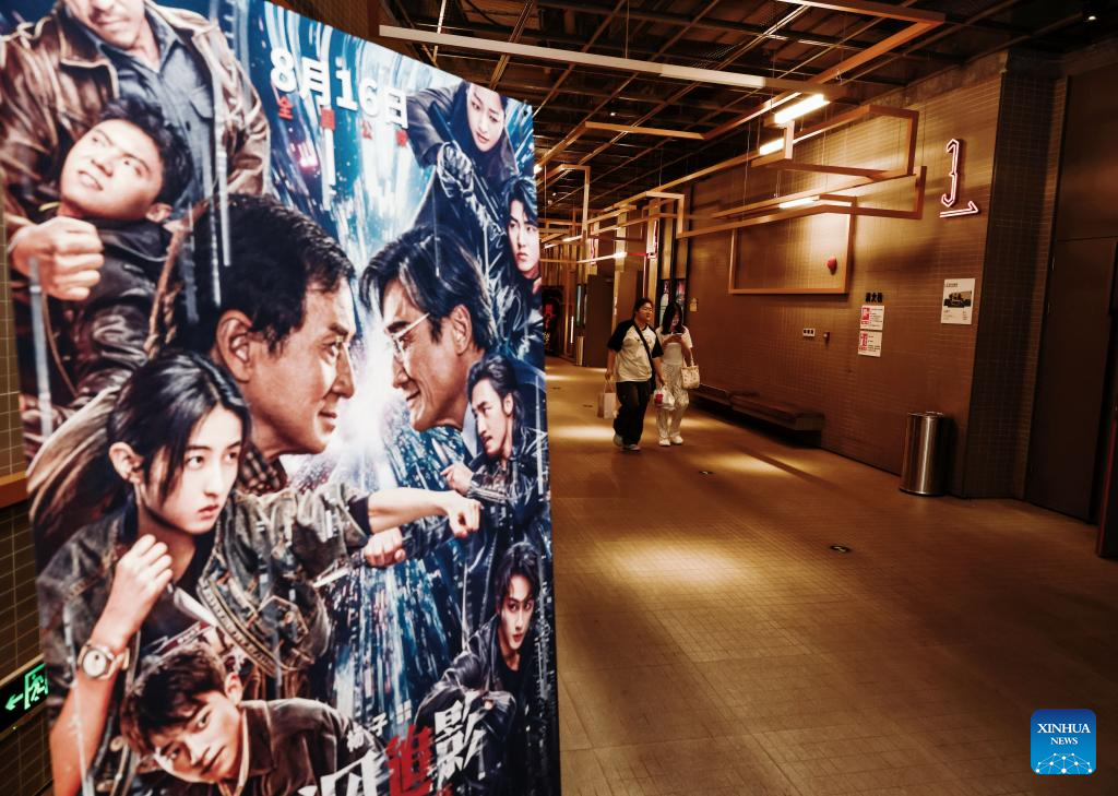 Spectators walk past movie posters at a cinema in Linyi, east China's Shandong Province, Aug. 18, 2025. China's summer box office revenue has surpassed 11 billion yuan (about 1.5 billion U.S. dollars) as of Sunday, with homegrown titles dominating the season's top earners. (Photo by Wu Jiquan/Xinhua)