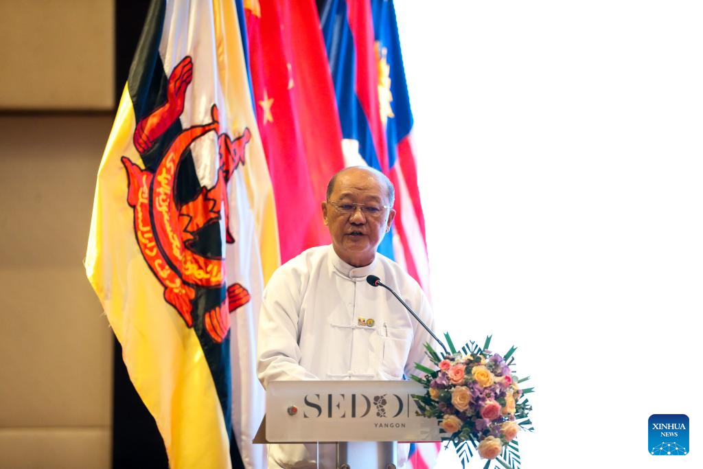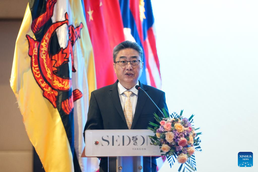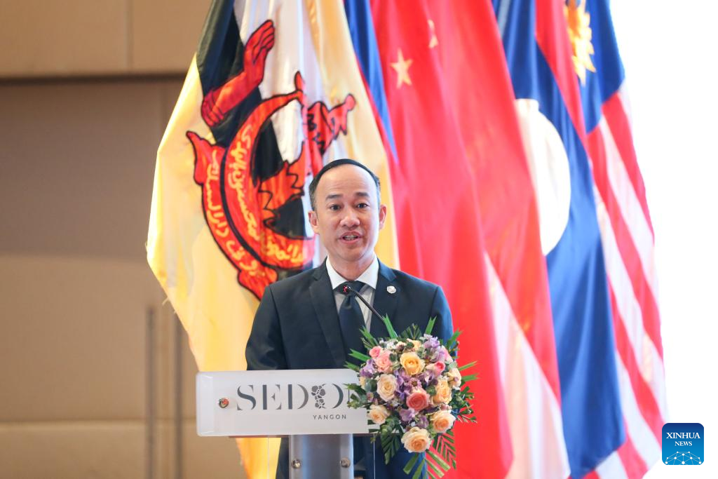 Secretary-General of the Association of Southeast Asian Nations (ASEAN)-China Centre (ACC) Shi Zhongjun speaks during the ASEAN-China Tourism Security and Safety Forum in Yangon, Myanmar, Aug. 25, 2025. The forum was jointly organized by the ACC, the Ministry of Hotels and Tourism of Myanmar, and the Lancang-Mekong Integrated Law Enforcement and Security Cooperation Center (LMLECC). It focused on building a solid safety barrier, advancing regional tourism development and prosperity, and exploring practical measures to address challenges. (Photo by Myo Kyaw Soe/Xinhua)