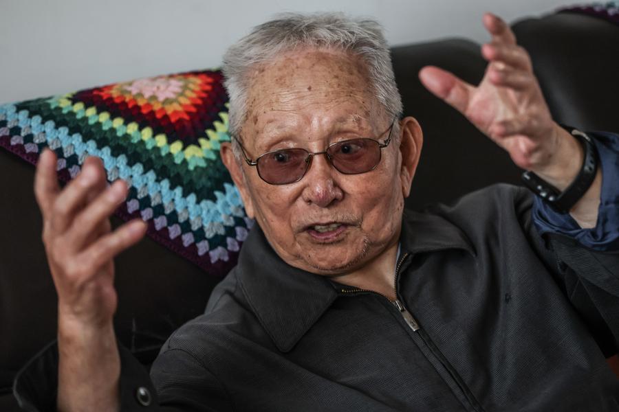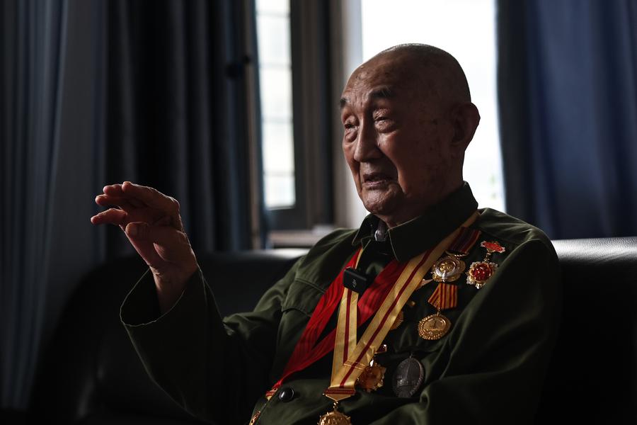 War veteran Yang Huafeng tells the story of his younger years in Shenyang, northeast China's Liaoning Province, June 30, 2025. (Xinhua/Pan Yulong)