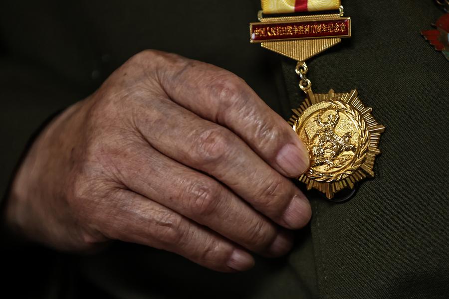 War veteran Yang Huafeng shows a commemorative medal he was awarded in Shenyang, northeast China's Liaoning Province, June 30, 2025. (Xinhua/Pan Yulong)