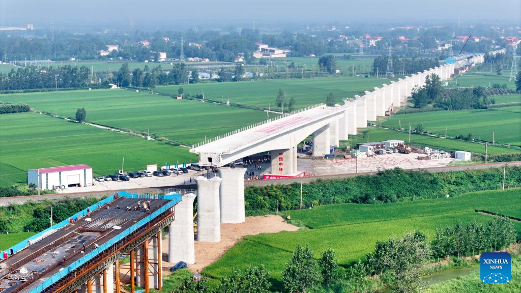 An aerial drone photo taken on Aug. 28, 2025 shows the T-beam of the Shuhe River super major bridge along the Weifang-Suqian high-speed railway rotating to its desired position in Tancheng of Linyi City, north China's Shandong Province. The T-beam successfully rotated to its desired position on Thursday. The Weifang-Suqian high-speed railway crosses over the Jiaozhou-Xinyi railway by the Shuhe River super major bridge, which is now under construction here. (Xinhua/Guo Xulei)