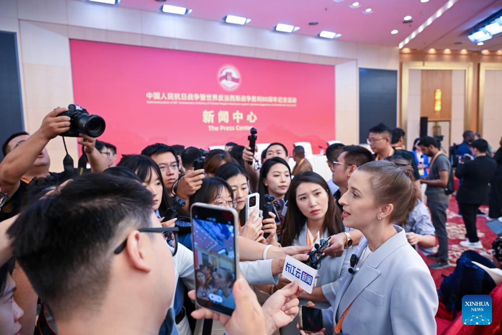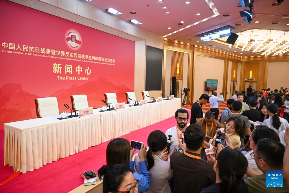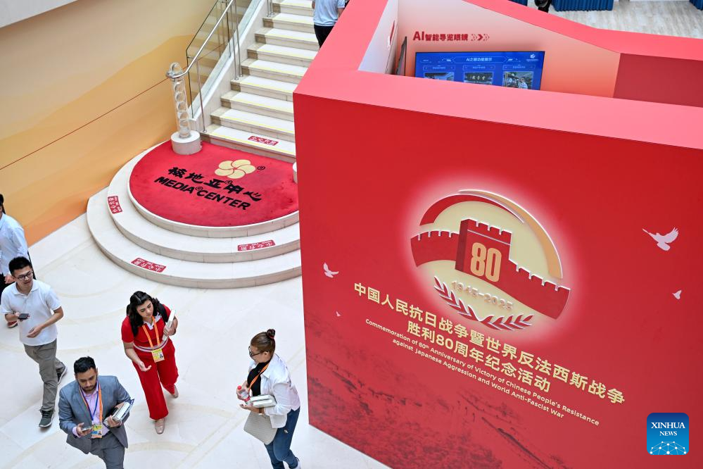 Journalists make interviews at the press center of Commemoration of 80th Anniversary of Victory of Chinese People's Resistance against Japanese Aggression and World Anti-Fascist War in Beijing, capital of China, Aug. 28, 2025. The press center has opened here on Wednesday.