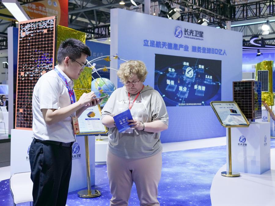 An exhibitor (L) and a guest talk at the 15th China-Northeast Asia Expo in Changchun, northeast China's Jilin Province, Aug. 27, 2025. The 15th China-Northeast Asia Expo kicked off here on Wednesday. (Xinhua/Zhang Nan)
