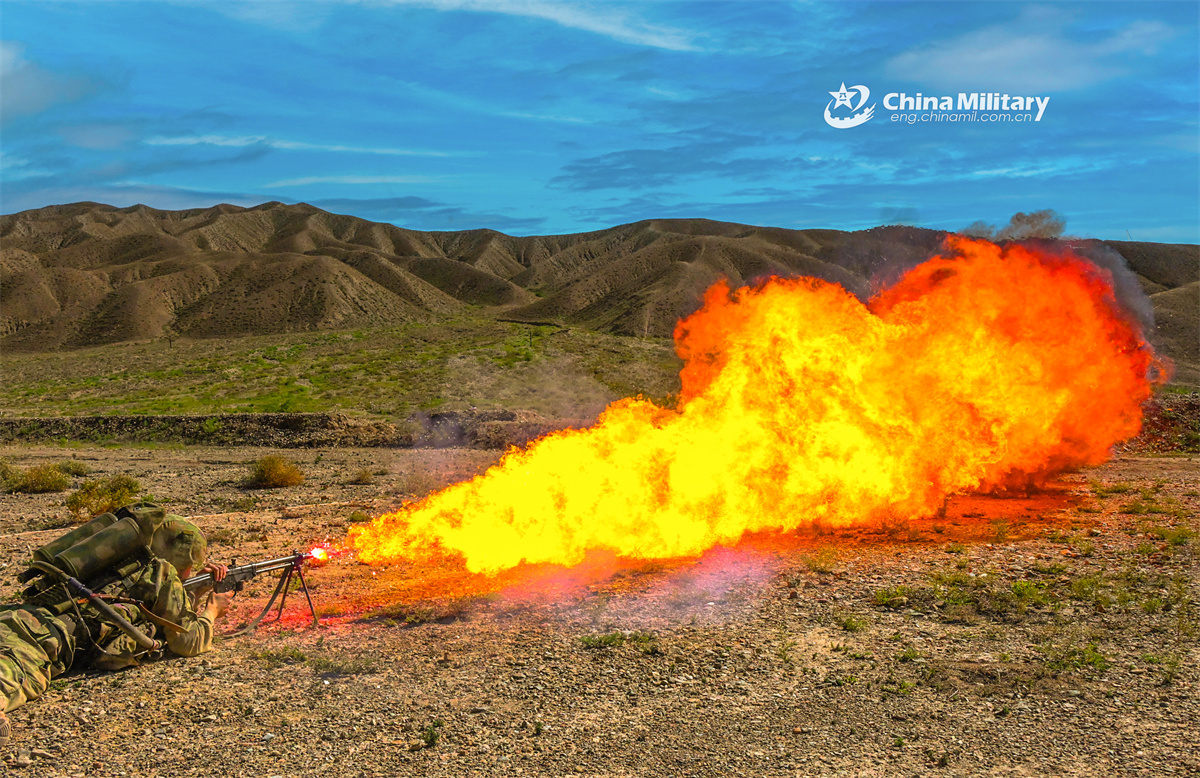 A soldier assigned to a brigade under the Chinese PLA Army ignites controlled fire with a flamethrower against a fire-proof wall during a live-fire training exercise on August 15, 2025. (eng.chinamil.com.cn/Photo by Liao Yixin)