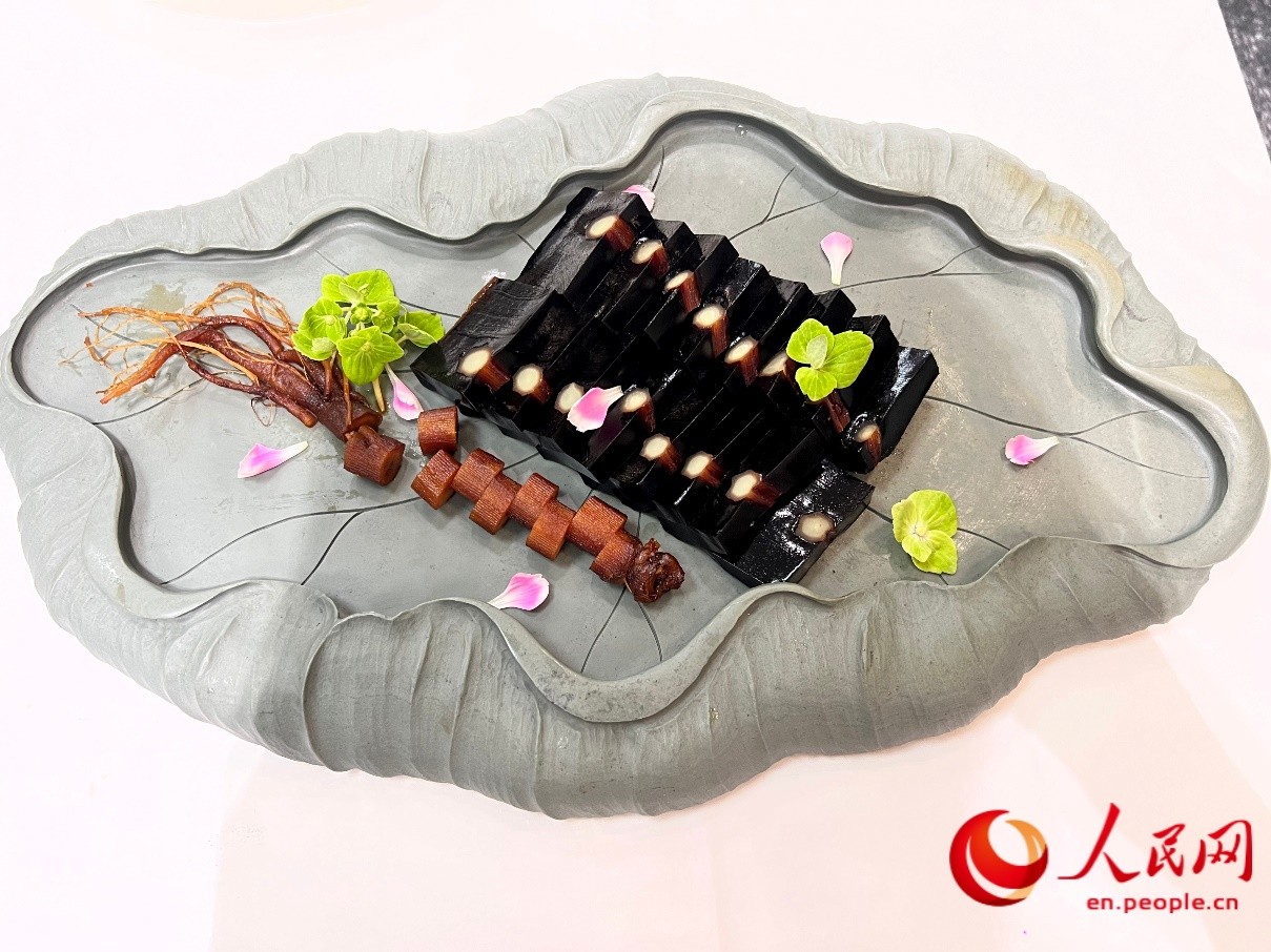 Ginseng simmered with deer-hide gelatin, complemented by honey and fruit for a mildly sweet taste and a smooth, tender, and pleasantly springy texture at a restaurant in Tonghua, northeast China's Jilin Province. (People's Daily Online/Zhao Tong)