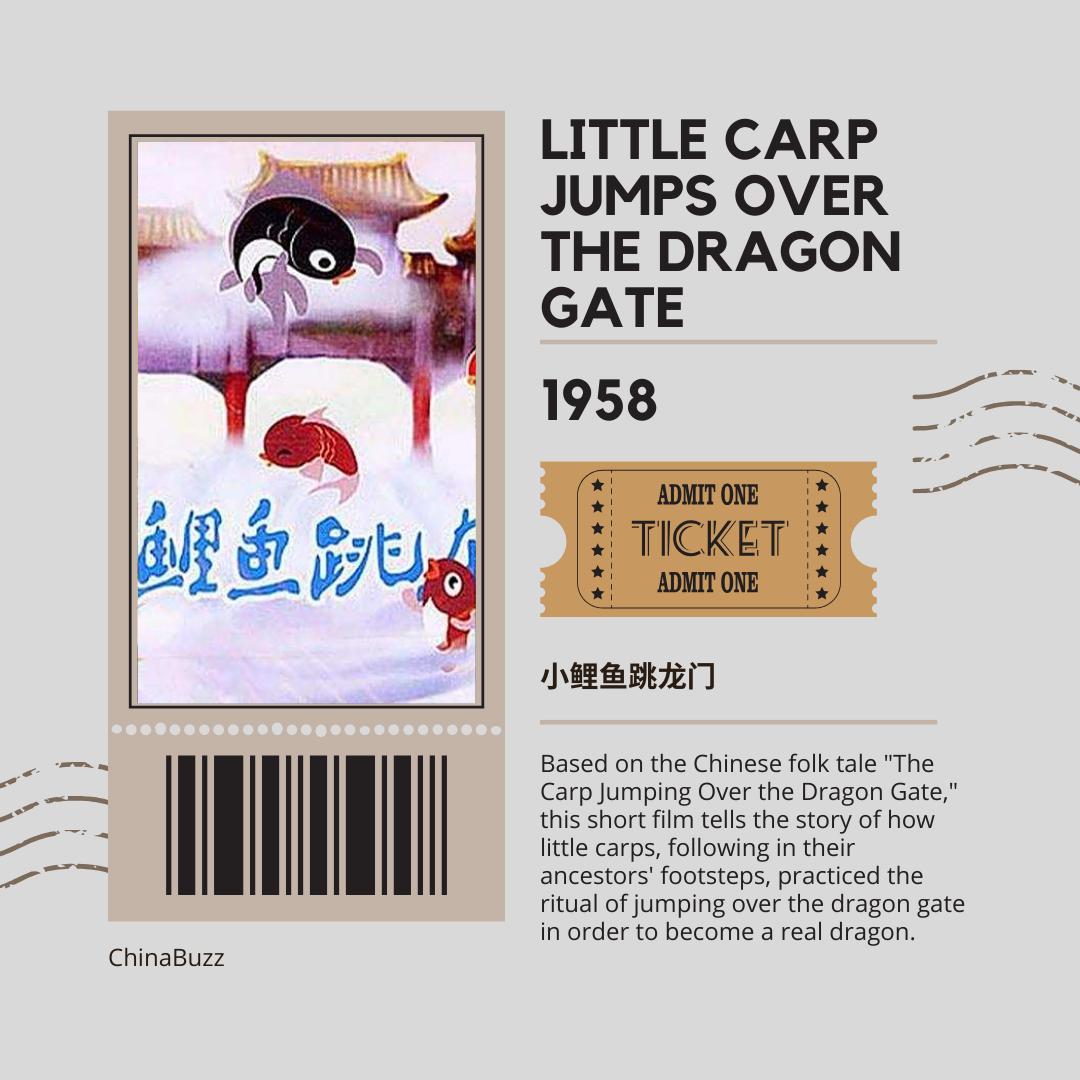 "Little Carp Jumps Over the Dragon Gate" is an animated film created by Shanghai Animation Film Studio. It is based on the Chinese folktale of carp jumping over the Dragon Gate and becoming dragons. In 1959, it was awarded the Silver Award for Animation at the First Moscow International Film Festival.