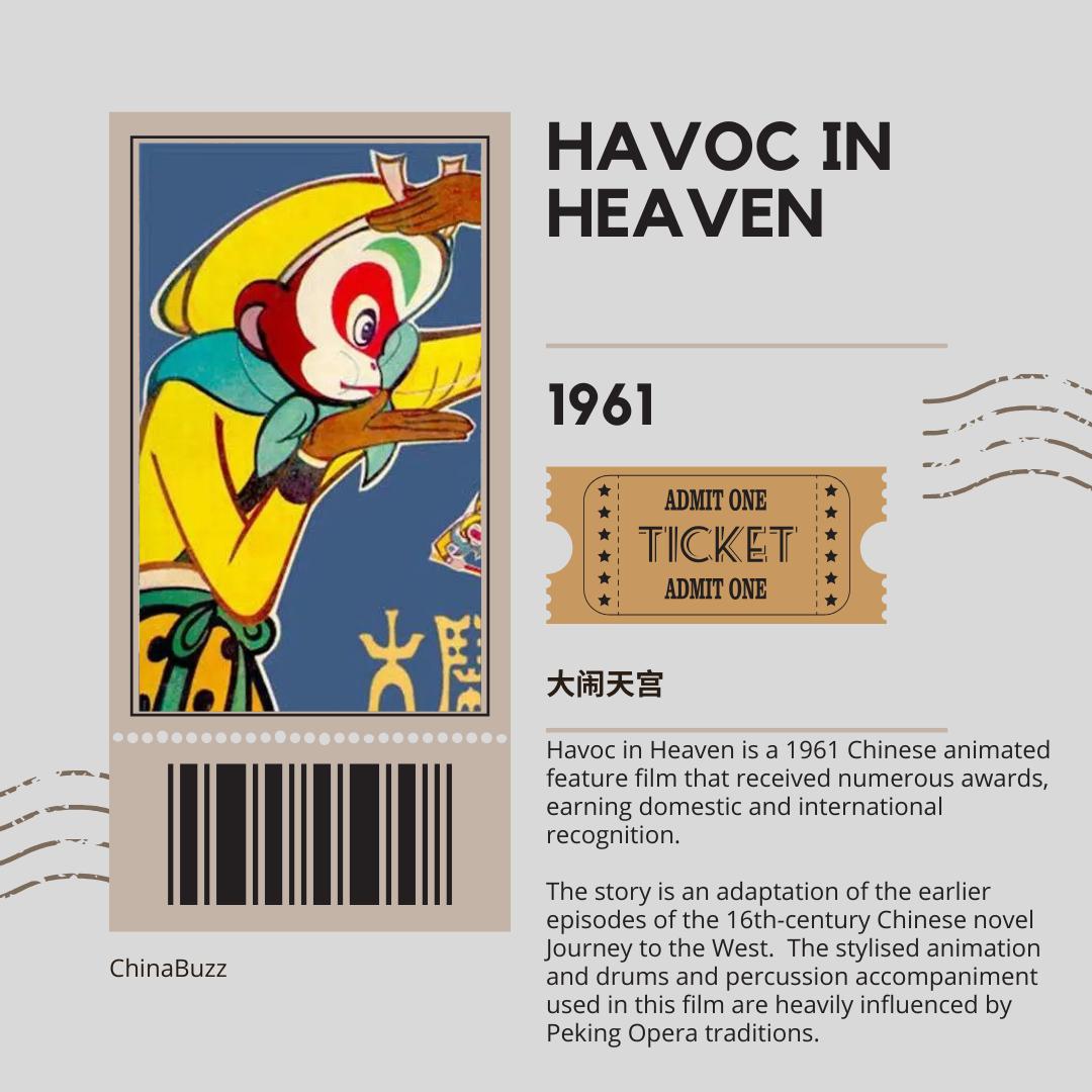 "Havoc in Heaven" is a 1961 Chinese animated feature film produced by Shanghai Animation Film Studio. The film received multiple honors, both domestic and foreign. The animation is an adaption of the first few chapters of the 16th-century Chinese novel "Journey to the West." The main character is Sun Wukong, also known as the Monkey King, who rebels against the Jade Emperor of Heaven.