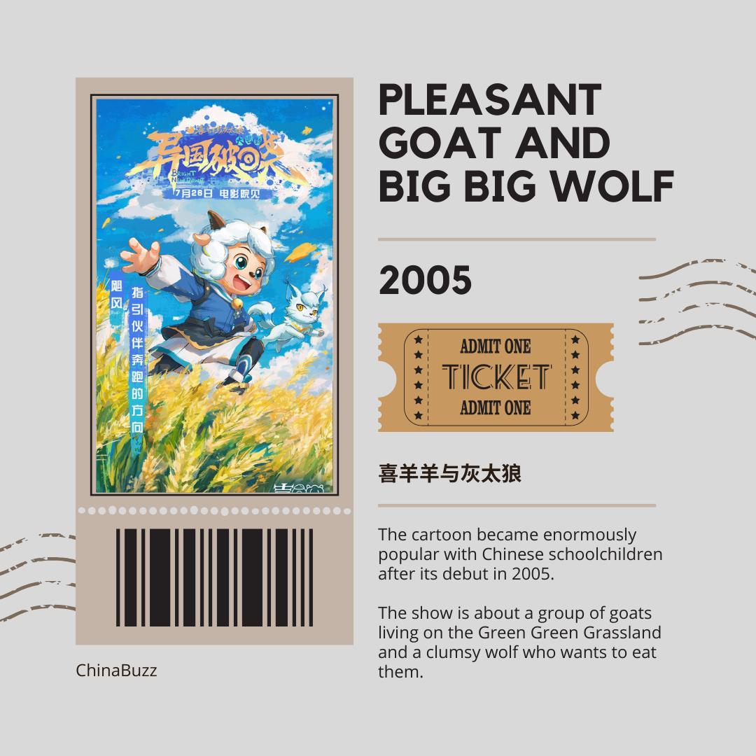 The cartoon became enormously popular with Chinese schoolchildren after its debut in 2005. The story centers on a group of goats living in Goat Village of Green Green Grassland. Weslie, one of the main characters, is a goat who wears a blue ribbon with a bell around his neck. Smart and optimistic, he always comes up with good ideas to help others and save the goats from getting eaten by Wolffy.