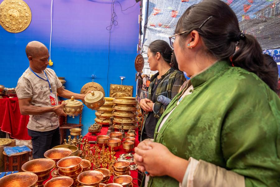 A businessman from Nepal showcases products to customers at an import commodity fair in Qamdo City, southwest China's Xizang Autonomous Region, Aug. 19, 2024. (Xinhua/Tenzing Nima Qadhup)