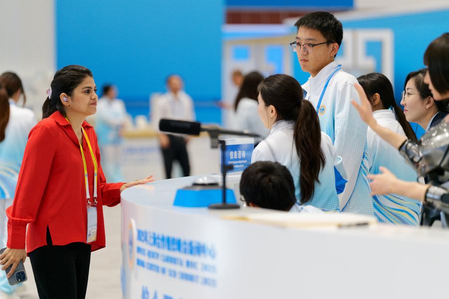 Volunteers help a foreign reporter at the media center for the Shanghai Cooperation Organization (SCO) Summit 2025 in north China's Tianjin on Aug. 30, 2025. (Xinhua/Zhang Xiaoyu)