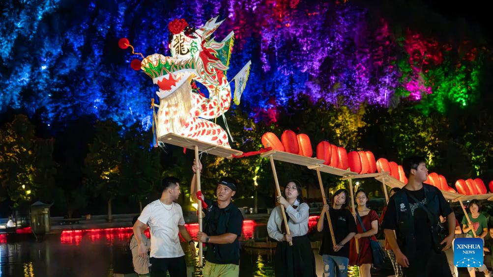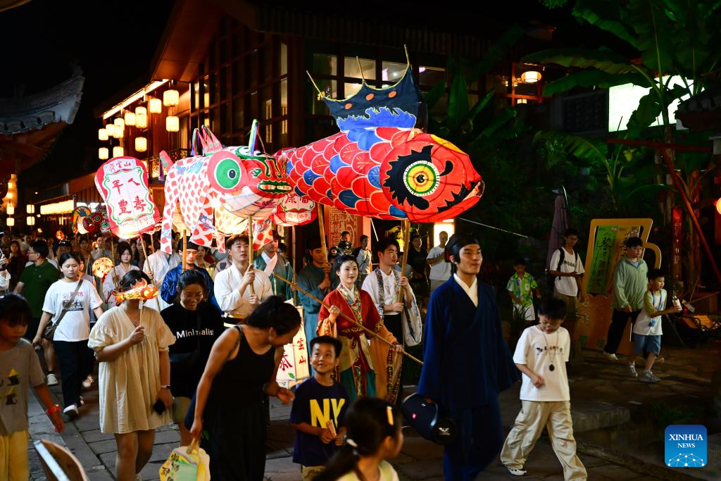 Tourists watch a parade of the fish-shaped lanterns in Xiuning County of Huangshan City, east China's Anhui Province, Aug. 27, 2025. The summer cultural tourism market is thriving in Anhui Province, with the intangible cultural heritages becoming a major draw for visitors. Various activities provide diverse travel experiences for tourists, vitalizing the tourism sector of the province continuously. (Xinhua/Zhou Mu)