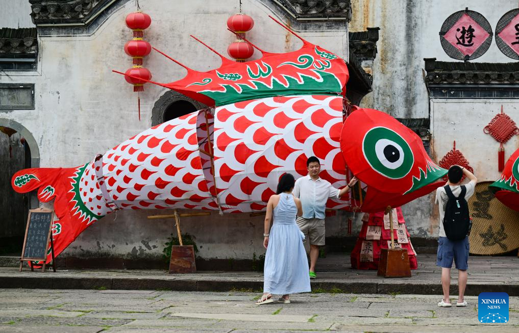 Tourists take pictures in front of a fish-shaped lantern in Chengkan Village, Huizhou District, Huangshan City of east China's Anhui Province, Aug. 21, 2025. The summer cultural tourism market is thriving in Anhui Province, with the intangible cultural heritages becoming a major draw for visitors. Various activities provide diverse travel experiences for tourists, vitalizing the tourism sector of the province continuously. (Xinhua/Zhou Mu)
