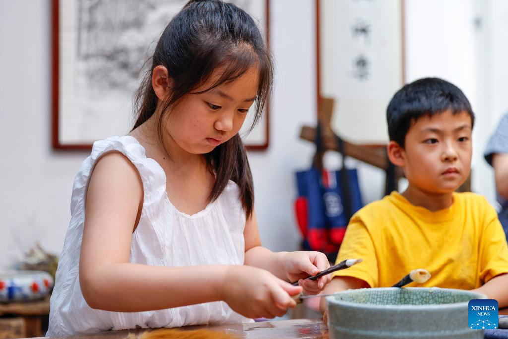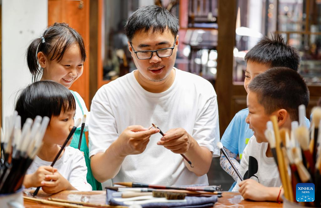 Kids learn to make ink brush in Huangshan City of east China's Anhui Province, Aug. 27, 2025. The summer cultural tourism market is thriving in Anhui Province, with the intangible cultural heritages becoming a major draw for visitors. Various activities provide diverse travel experiences for tourists, vitalizing the tourism sector of the province continuously. (Photo by Shi Yalei/Xinhua)