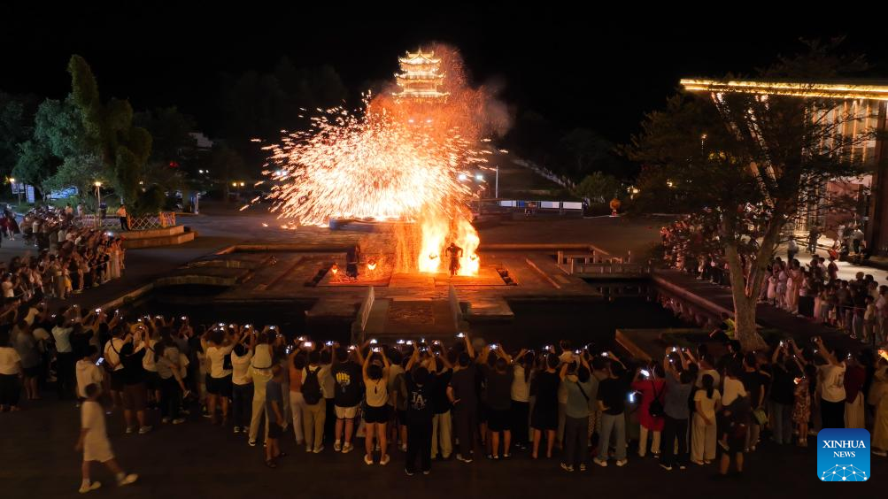 A performance of the molten iron fireworks is staged in Xiuning County of Huangshan City, east China's Anhui Province, Aug. 27, 2025. The summer cultural tourism market is thriving in Anhui Province, with the intangible cultural heritages becoming a major draw for visitors. Various activities provide diverse travel experiences for tourists, vitalizing the tourism sector of the province continuously. (Xinhua/Zhou Mu)