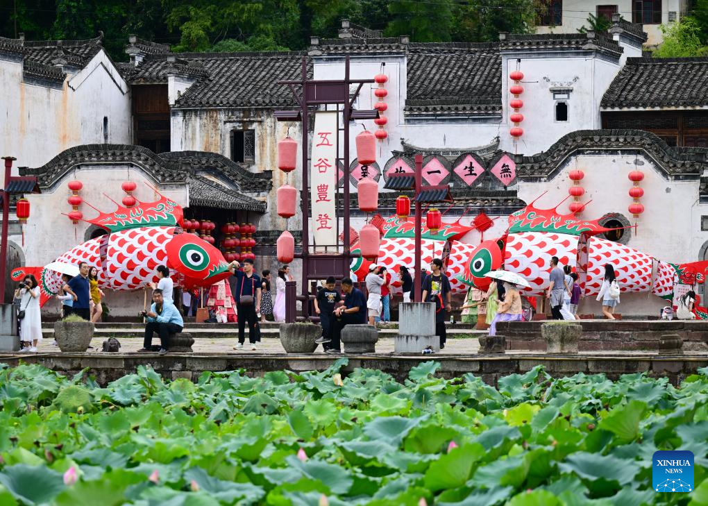 Tourists watch the fish-shaped lanterns in Chengkan Village, Huizhou District, Huangshan City of east China's Anhui Province, Aug. 21, 2025. The summer cultural tourism market is thriving in Anhui Province, with the intangible cultural heritages becoming a major draw for visitors. Various activities provide diverse travel experiences for tourists, vitalizing the tourism sector of the province continuously. (Xinhua/Zhou Mu)