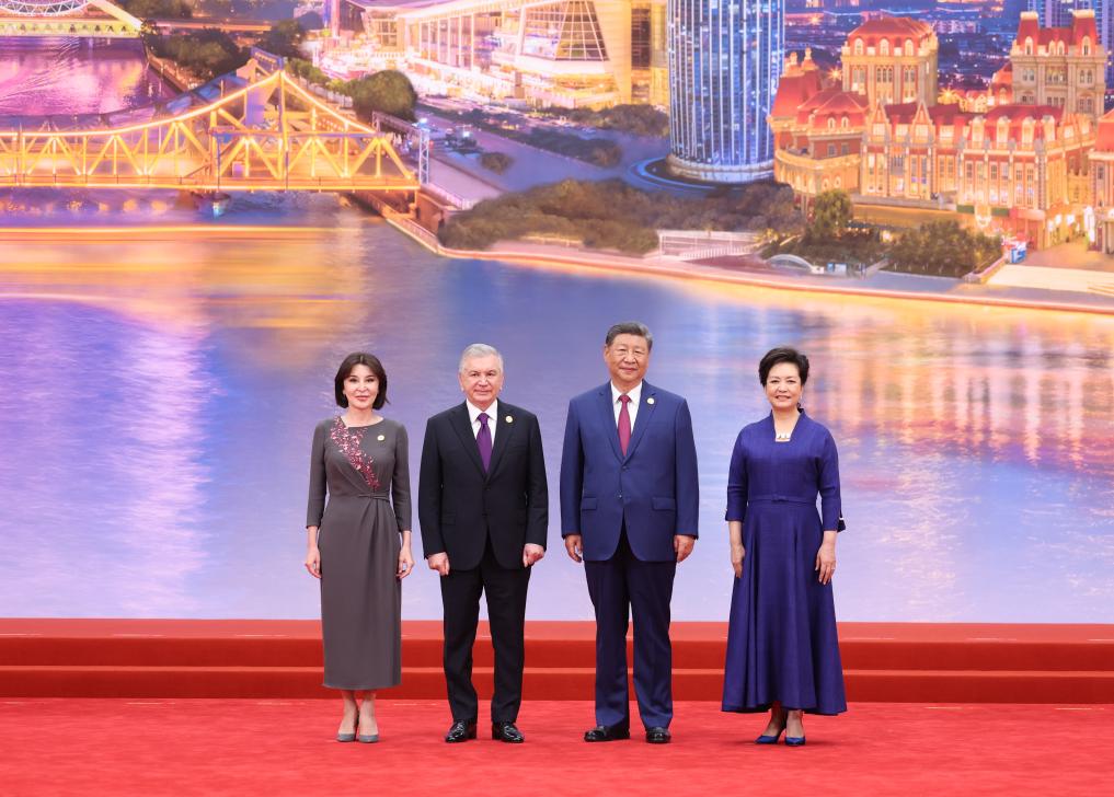 Chinese President Xi Jinping and his wife, Peng Liyuan, pose for a group photo with Uzbek President Shavkat Mirziyoyev and his wife at the Meijiang Convention and Exhibition Center in Tianjin, north China, Aug. 31, 2025. Xi and Peng on Sunday hosted a banquet in China's port city of Tianjin to welcome international guests who are here to attend the Shanghai Cooperation Organization (SCO) Summit 2025. (Xinhua/Huang Jingwen)