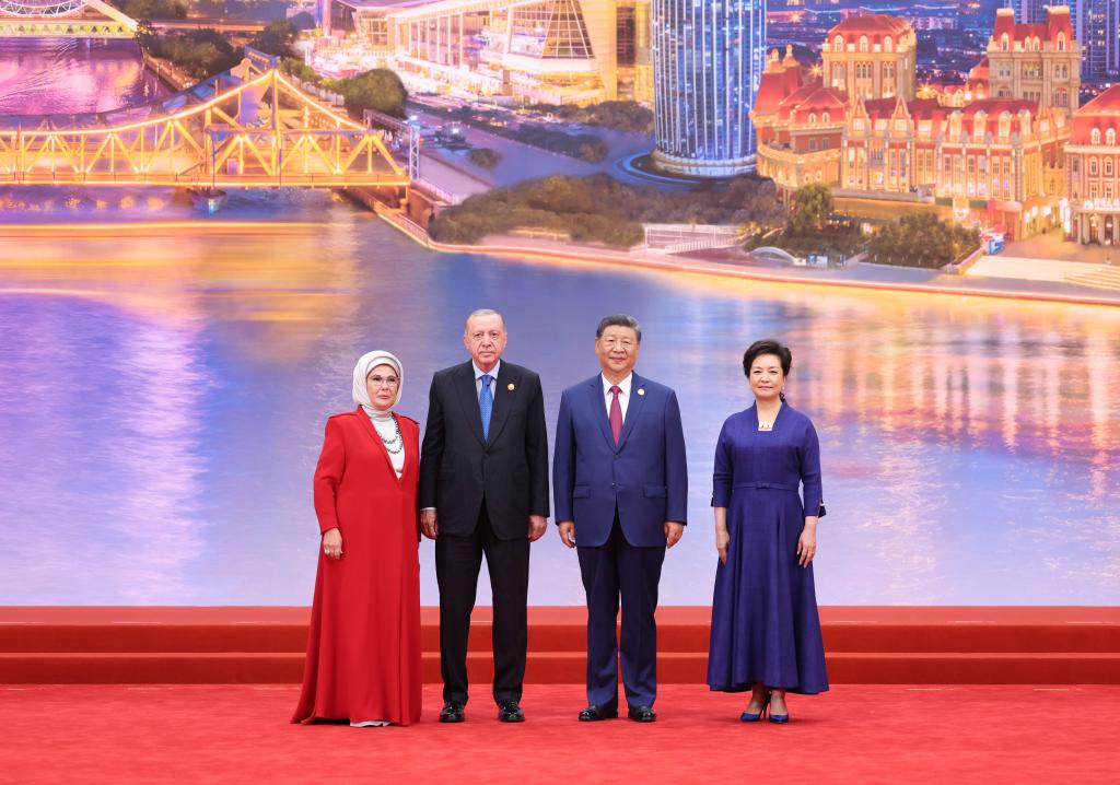 Chinese President Xi Jinping and his wife, Peng Liyuan, pose for a group photo with Turkish President Recep Tayyip Erdogan and his wife at the Meijiang Convention and Exhibition Center in Tianjin, north China, Aug. 31, 2025. Xi and Peng on Sunday hosted a banquet in China's port city of Tianjin to welcome international guests who are here to attend the Shanghai Cooperation Organization (SCO) Summit 2025. (Xinhua/Huang Jingwen)